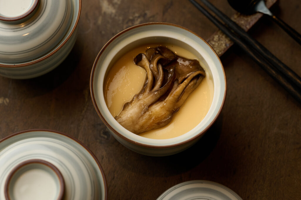 以鮮美的雞高湯調和風味,在蛋中添加香濃的莫札瑞拉起司增 添食趣,上方點綴舞菇捎來一抹鮮味,整體看似簡單、實則濃郁 富有層次。