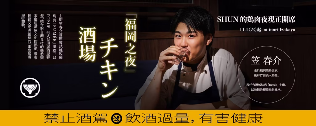 inari Izakaya 將於冬季推出「福岡之夜・雞肉酒場 by Shun」主題餐期,分為兩階段限時登場。首波自 2025 年 11 月 1 日至 12 月 15 日登場,由 Shun 主廚以最擅長的雞肉料理揭開序幕;第二波則於 2025 年 12 月 16 日至 2026 年 1 月 31 日接續登場,套餐內容與配菜將隨季節微調,並融入海鮮與 福岡代表性食材「明太子」,邀饕客再度造訪,體驗進化版「福岡之夜」。本次聯名套餐每套 NTD 1,580 +10%,以九州風味雞料理為主軸,搭配當季食材呈現多層次風味。